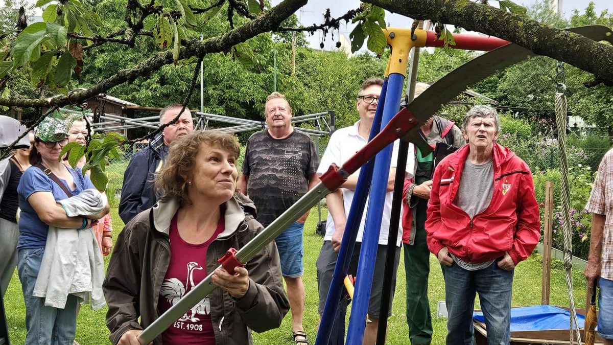 Seit Wochen erleben wir ein Auf und Ab bei den Temperaturen und viele können allmählich keinen Regen mehr sehen. Der Juli begann nun unterkühlt, nachdem am zurückliegenden Wochenende zum Teil Unwetter schwüle und schweißtreibende Hitze verdrängt haben. Sogar am Baumschnitttag, dem 12.07.2024, mussten wir um die Veranstaltung bangen. Mittags zog ein schlimmes Unwetter auf mit beeindruckenden Hagelkörnern über Tamm. Wir ließen es darauf ankommen und tatsächlich fanden sich nicht nur Gartenfreunde, unser Fachberater Herr Dieter Pailer, sowie Frau Martina Rist von der Beratungsstelle für Obst- und Gartenbau beim Landratsamt Ludwigsburg, um 17.00 Uhr am Treffpunkt ein – auch 16 tapfere Interessenten fanden den Weg zu uns. Sogar ein Vertreter der Gartenfreunde Ingersheim besuchte unsere Veranstaltung. Bis auf leichte Regenschauer hatten wir mal wieder so richtig Glück mit dem Wetter. Martina Rist freute sich darüber, viele bekannte Gesichter zu sehen und schon legten wir los.
