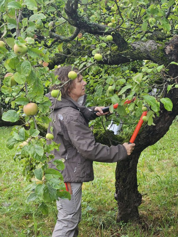 Wir begannen auch unseren Kurs mit einer großen alten Kirsche, im Garten von Karin und Celal Ernst-Kirandi. Der Schnitt im Sommer dämpft starkes Wachstum, welches typisch für Süßkirschen ist. Gut ausgerüstet mit Licht und Luft ließen wir die Kirsche zurück und gingen auf Wunsch eines Teilnehmers weiter zu einem Apfelbaum mit großem Frucht Reichtum. Entfernt bzw. gekürzt wurden einzelne Triebe, welche am Baum hängende Früchte beschatten. Ebenfalls entfernen kann man alte, nicht mehr hochwertig fruchttragende Äste.