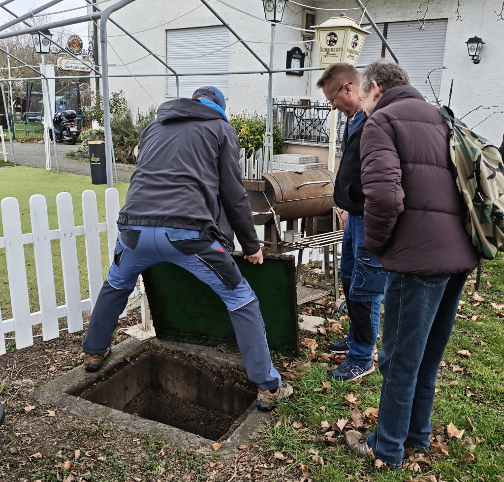 Schnell war der Gully an der Ludwigsburger Straße geöffnet und warteten auf den Wagemutigen, der sich hinab trauen musste, um die beiden Wasserventile aufzudrehen. Das Wasser war schnell aufgedreht, doch in der Gartenanlage am geteerten Gemeindeweg schien etwas nicht dicht zu sein.