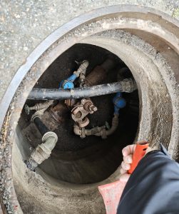 Nach kurzer Zeit wurde eine Wasseruhr gefunden, die bereits angeschlossen, aber undicht war. Voller Vorfreude zeigte es sich aber an der Wasseruhr, dass es nicht die einzige Leckage war. Schnell wurde wieder überall gesucht… Jeder Wasserschacht in den Gärten wurde geprüft. Bis endlich jemand am allerletzten Garten einen undichten Hahn gefunden hatte, dauerte es doch bange Minuten. Schließlich hätte ja auch die Leitung selbst über den Winter undicht werden können.